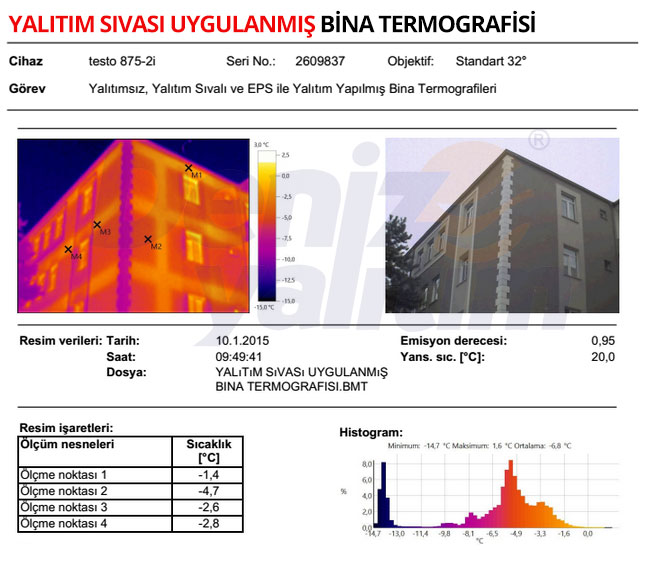 Yalıtım yapılmamış, yalıtım sıvası uygulanmış ve EPS ile yalıtım yapılmış binaları termal kamera ile termografik görüntülerini aldık. Bu termograflardan da yalıtım yapılmamış ve yalıtım sıvası uygulanmış binalarda oluşan ısı köprüleri rahatça görülürken EPS ile yalıtım yapılmış binada ısı köprüsü olmadığını belirledik. Bu ısı köprüleri ısıtma giderlerinin yükselmesindeki faktörlerden biridir. Doğru kalınlık ve yoğunluktaki EPS ile yalıtım yapılan binalarda %40-60’lara ulaşan enerji tasarrufu sağlanmaktadır.